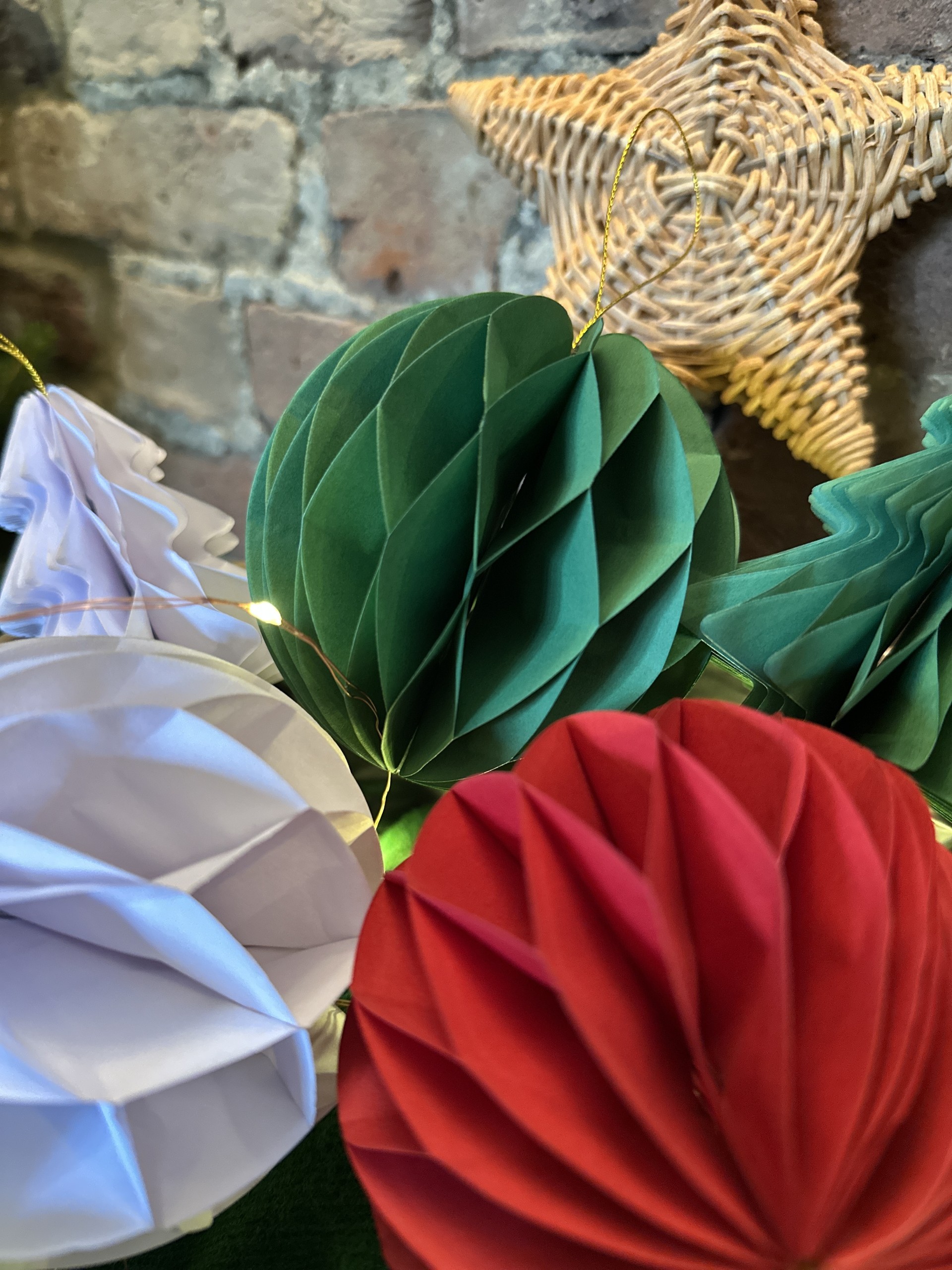 24 reusable paper decorations - 9 green, 9 white, and 9 red